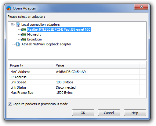 After installation, you will be prompted to select a network adapter to view stats from. You can also enable capturing packets in promiscuous mode by checking the relevant checkbox. Chose an adapter and hit Ok.