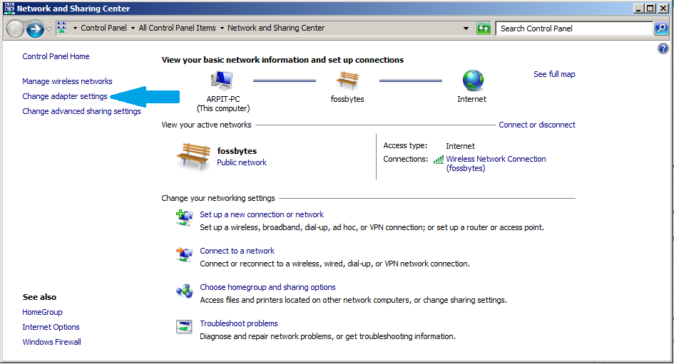 - Now click on Change adapter setting. Since I am using Windows Classic theme here, so you might find a little change in the icons, but I assure you that the method is same in Windows 7, Windows 8, and Windows 10.