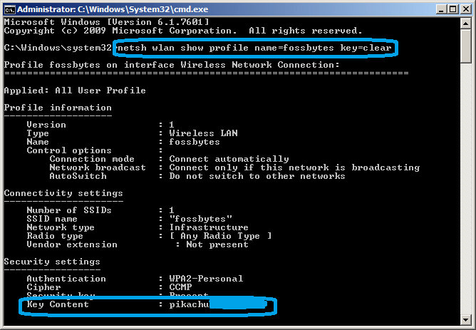 <strong>netsh wlan show profile name=fossbytes key=clear</strong>