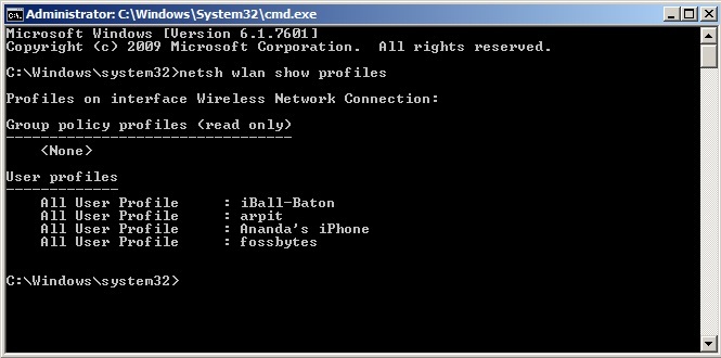 - Once Command Prompt is opened, you need to type the following command in it (Replace fossbytes with your WiFi network name), and hit enter.
